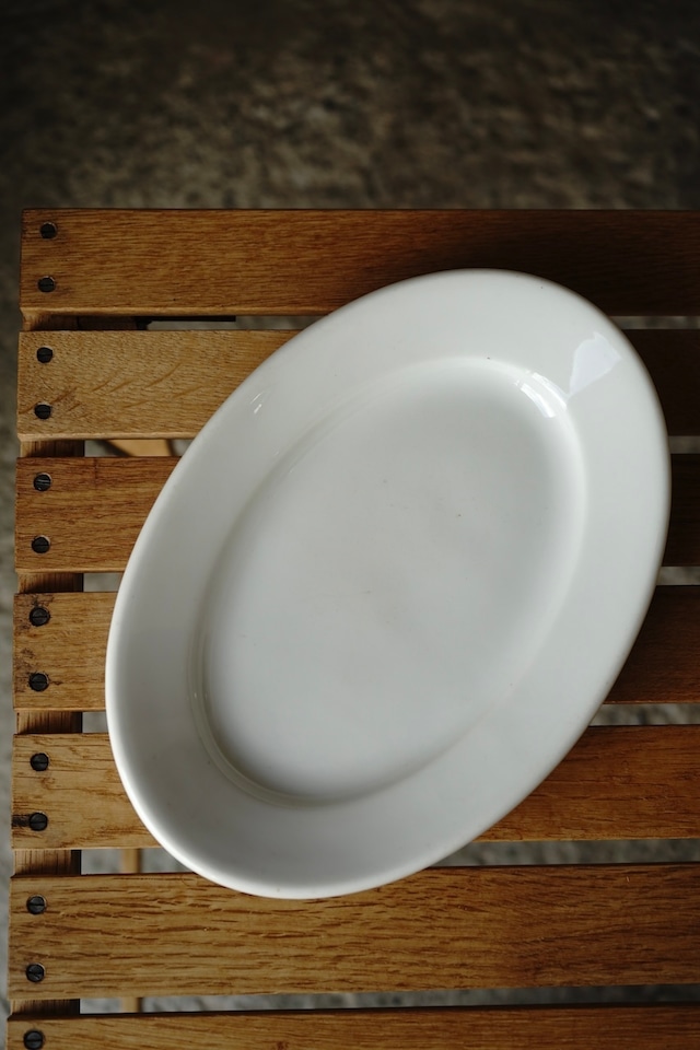 19世紀〜20世紀初頭にかけてフランスで作られた、オーバル皿(23cm)です。 細かなニュウやカトラリー跡など、時を経てきた美しさがあります。 23cmのオーバル皿は使い勝手の良い小さめなサイズ感です。 オーバルの形状がお料理を素敵に引き立ててくれます。 〜French Antique Plate〜 当時のフランス食器はその材質が独特で魅力的です。 イギリスの上流階級の人達が使っていた磁器質の食器をフランスでも模して作っていたのですが、フランス国内で手に入る道具や焼成技術では、目指していた物は作れず、陶器と磁器の中間に当たる"半陶半磁"(テールドフェール)という独自の素材で作られた食器が流通していました。 (※さらに古いものはファイアンスフィーヌと呼ばれます) 結果、当初目指していた磁器質の高貴な食器ではないものの、半分陶器らしい土っぽさ、半分磁器質な上品さが相まった温もりのある大らかな食器が出来上がったのです。 シンプルな佇まいですが日常に溶け込む素敵な食器です。 バックスタンプを調べて年号などを判別するのも1つの楽しみ方です。 是非日々の食卓でフランスアンティークを取り入れてみてください! Made in France ●Condition 古き時代のアンティークです。ニュウ、キズ・カトラリー跡、シミなどがあります。 状態は写真でご確認ください。 アンティークの物としてご理解の上お求めくださいませ。 ●直径 約22cm 高さ 約3.5cm ※寸法について、誤差が生じる場合がございます。予めご了承くださいませ。 ※食器洗浄機、電子レンジ、オーブン、直火:いずれも不可