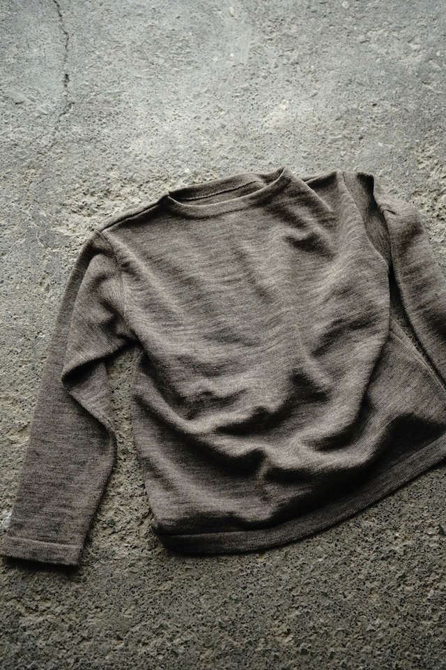 これまで衣類には不向きとされてきた北海道羊毛。長年洋服業界で得た知識を糸作り、パターン制作に活かし、HOKKAIDO WOOLの新たな価値を世に広めているSOLNORD(ソルノール)のバスクセーター。 WOOL100%でありながらカットソーやスウェット感覚の着心地は、私たち北海道民の生活道具の一つとして新たに提案したいアイテムです。 最もプリミティブな衣類=SOLNORD。 個人的にSOLNORDに抱いているイメージがこれです。 プリミティブ(primitive)なものとして、大地から採取した土を成型し薪をくべた炎で焼成する陶器や、大地に根を張り大樹となった幹から削り出して作り上げるアフリカンスツールなどが思い浮かぶが、これらの共通点は視覚的なデザインではなく、その土地の風土やその土地で生まれ育った人のアイデンティティが吹き込まれ、自然から物へとなっている。 北海道の大地から育まれる羊たちの羊毛を紡ぎ、編み立てられるSOLNORDのニットも同じようにプリミティブなものだと思える。しかもセーターは、愛でるだけではなく実際に身体に纏い肌で感じることが出来るのが素晴らしいところだと思う。 ヨコシマ模様に船底型ボートネックのカットソー、いわゆる"バスクシャツ"。バスクシャツで有名なセントジェームズ社はフランスの北部ノルマンディー地方のメーカーだが、バスクシャツの歴史を紐解くと元来ノルマンディー地方の羊の羊毛を使って編んだセーターが原型とされている。 海軍のユニフォームや海で働く漁師たちの仕事を支えたバスクセーターを、北海道の羊毛を使い仕立て上げたSOLNORDのバスクセーター。ここ北海道の暮らしや仕事を支える道具の1つとして浸透した時、それは新しい文化となるのかもしれない。 ●シルエットについて 70年代のフランス海軍で使用されていたバスクシャツを元に、現代のサイズ感にアレンジしたシルエット。1枚で着ても上に何か羽織ってもストレスのない無駄を省いた1着です ●どんな糸なのか 道産羊毛が持つ弾力と膨らみを活かしながら適度なシャリ感を出しています。強く撚っ多細い糸で、ニットの伸縮性を保ちながらカットソーの強さの出る糸にしています ●お手入れについて ウール100%なので基本的に着る度にお洗濯をする必要はありませんが、手洗いが可能です。ウールは防臭消臭効果や除湿性、シワになりにくい、形崩れしづらい、色落ちもしにくいなど機能的で、ウールそのものが持つ機能を存分に感じられると思います。 ●タグについて SOLNORDの製品には布のブランドタグを付けていません。あくまでブランドとしての所有力ではなく、単純にその物を好きになってもらえるのが理想だと思い、背面にさりげなく施したスクエア型の編み柄がSOLNORDの証です。 Made in Hokkaido ●Material Hokkaido wool 100% ●Color ・Natural(一見単色に見えるが道産羊毛特有の色のばらつきがあり、それをミックスすることで独特なメランジ感がうまれる。所々に出る黒やグレーのムラ感はサフォーク種を使用している証) ・Mix Gray(ナチュラルとブラックシープの原毛を独自の配分で混ぜ合わせた無染色での色出し。自然な風合いを活かした他にはないSOLNORDならではのカラーリング) ・Forest Green(グレーがかったグリーンが特徴。盛夏から初秋にかけて紅葉前の北海道の山をイメージ。都会的な印象の色味ですが、自然由来なストーリーです) ・KUROBENI(日本では江戸時代から高貴な色として扱われていた黒紅色。紅色で染色した後に黒を乗せ、奥行きのある色味に仕上げています) ●Size 2(着丈67cm 身幅60cm 裄丈80cm ) 3 (着丈 70cm 身幅 64cm 裄丈 85cm ) ※着用レディースモデル 身長162cm / size 2着用 ※着用メンズモデル 身長170cm / size 2 着用 ※サイズやその他、ご不明点などございましたら、お気軽にお問い合わせくださいませ。