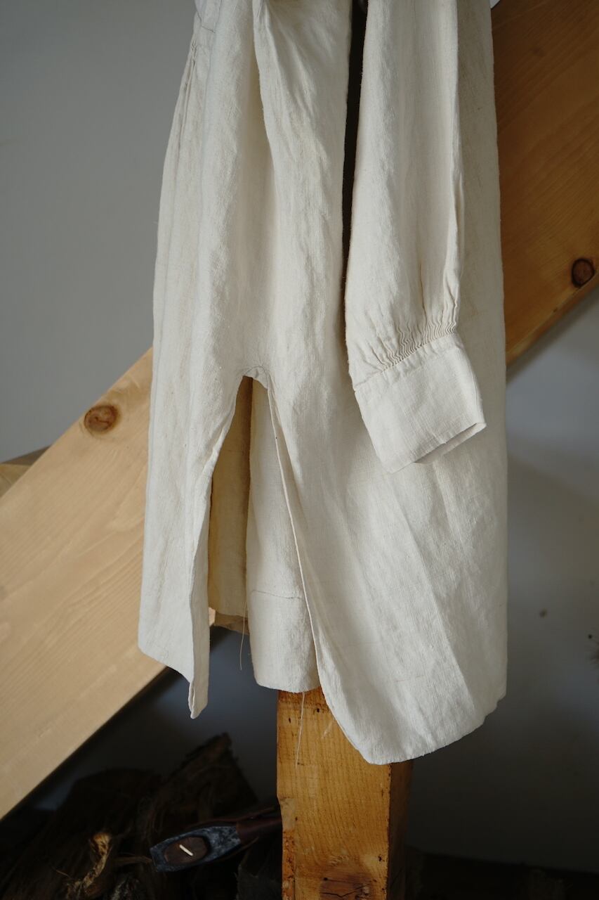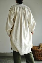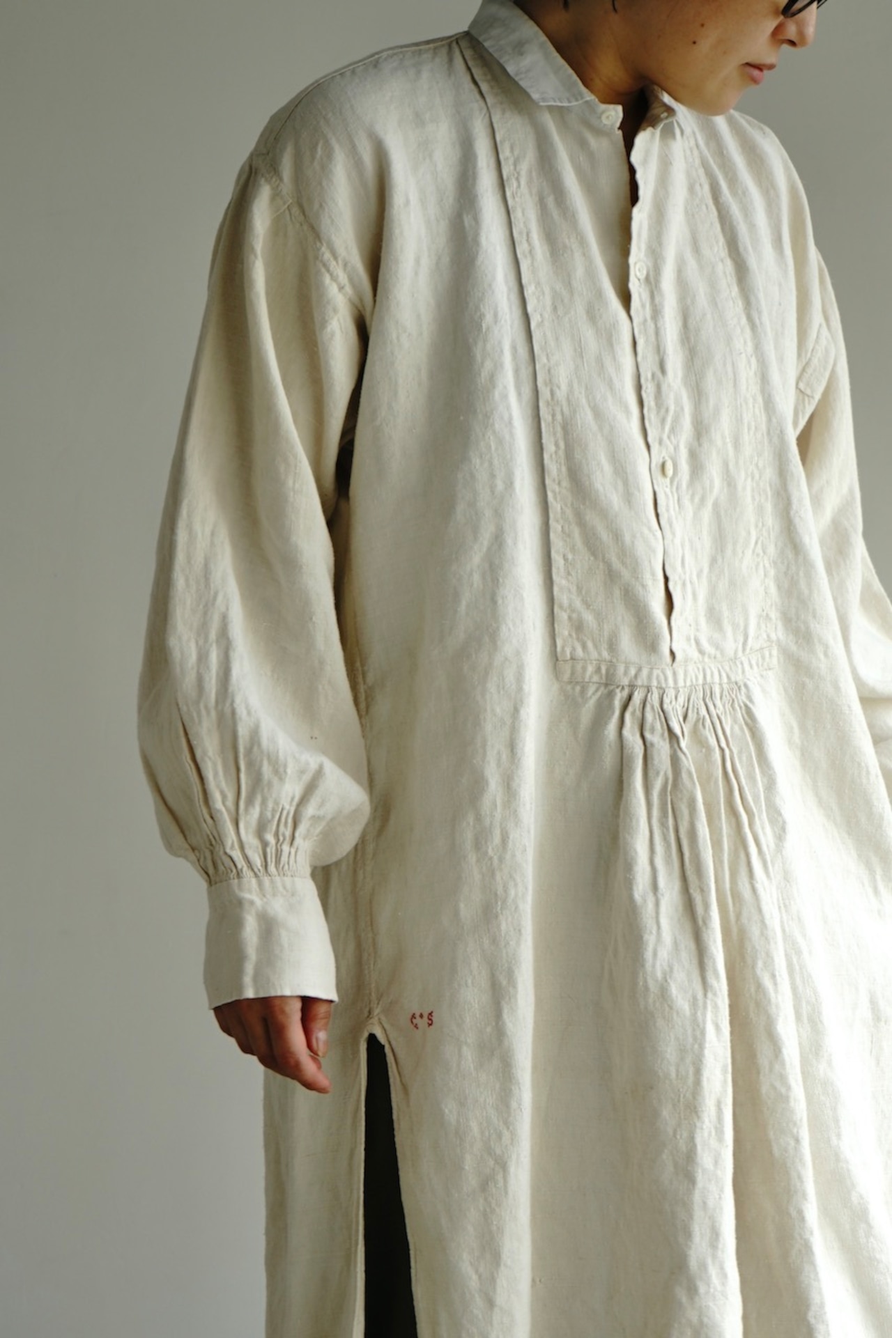 フランスのヴィンテージリネンスモックです。しっかりと厚さがありつつとろみのあるリネンの風合いはヴィンテージならでは。袖口と首の後ろにはとても細かなシャーリングが施されており、細かな手仕事に目を奪われてしまう美しい1着です。