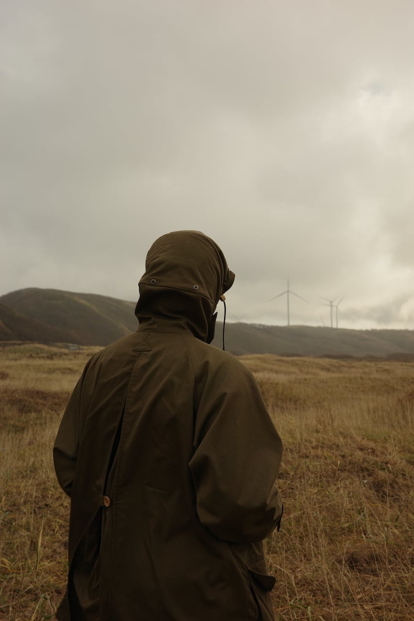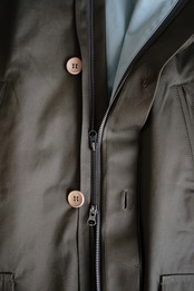 このアウターの最大の特徴でもあるのが折りたたみ式のフード。見せかけだけのデザインではなくしっかりと雨を防げる大きさ。綺麗に襟元に収まります。