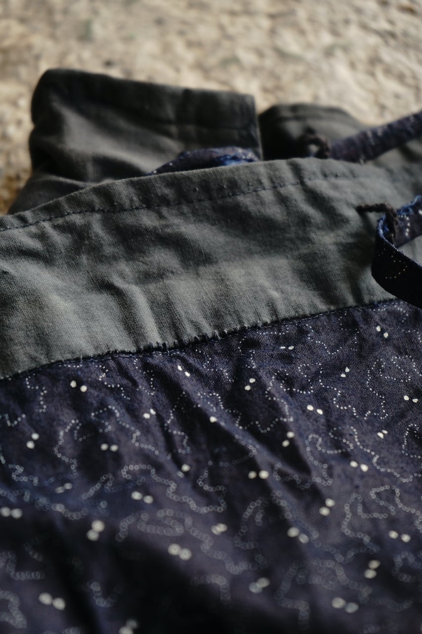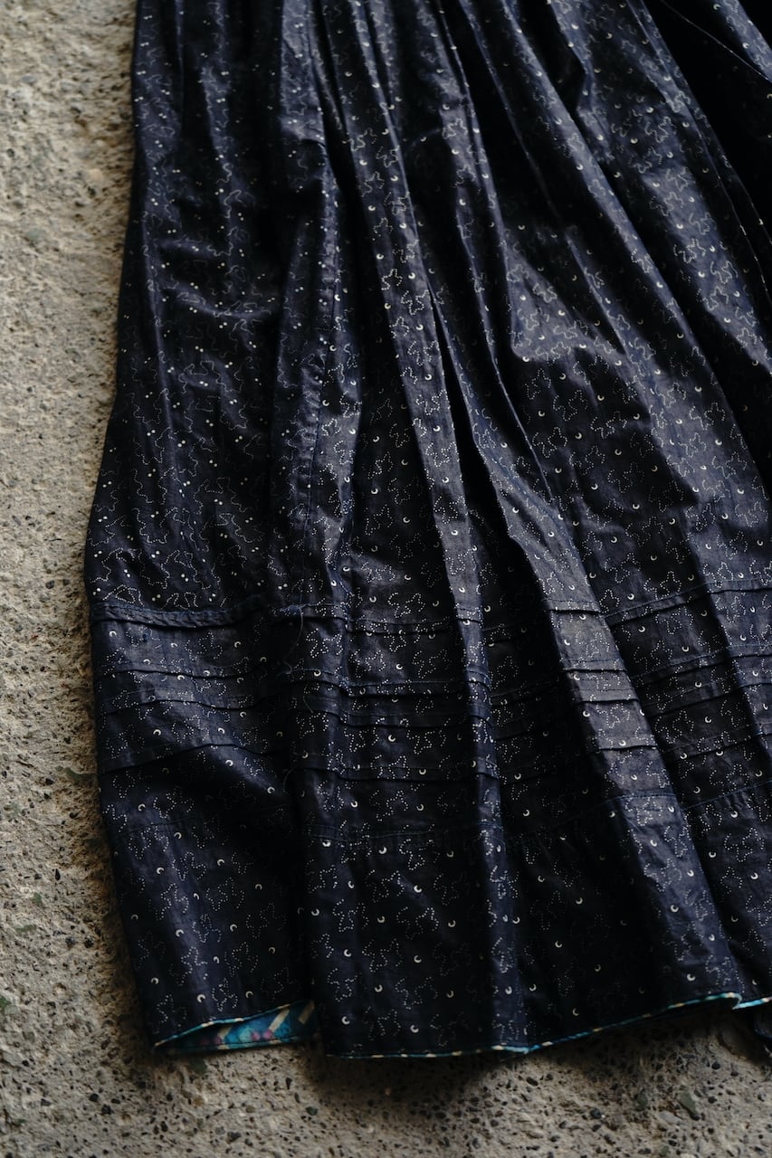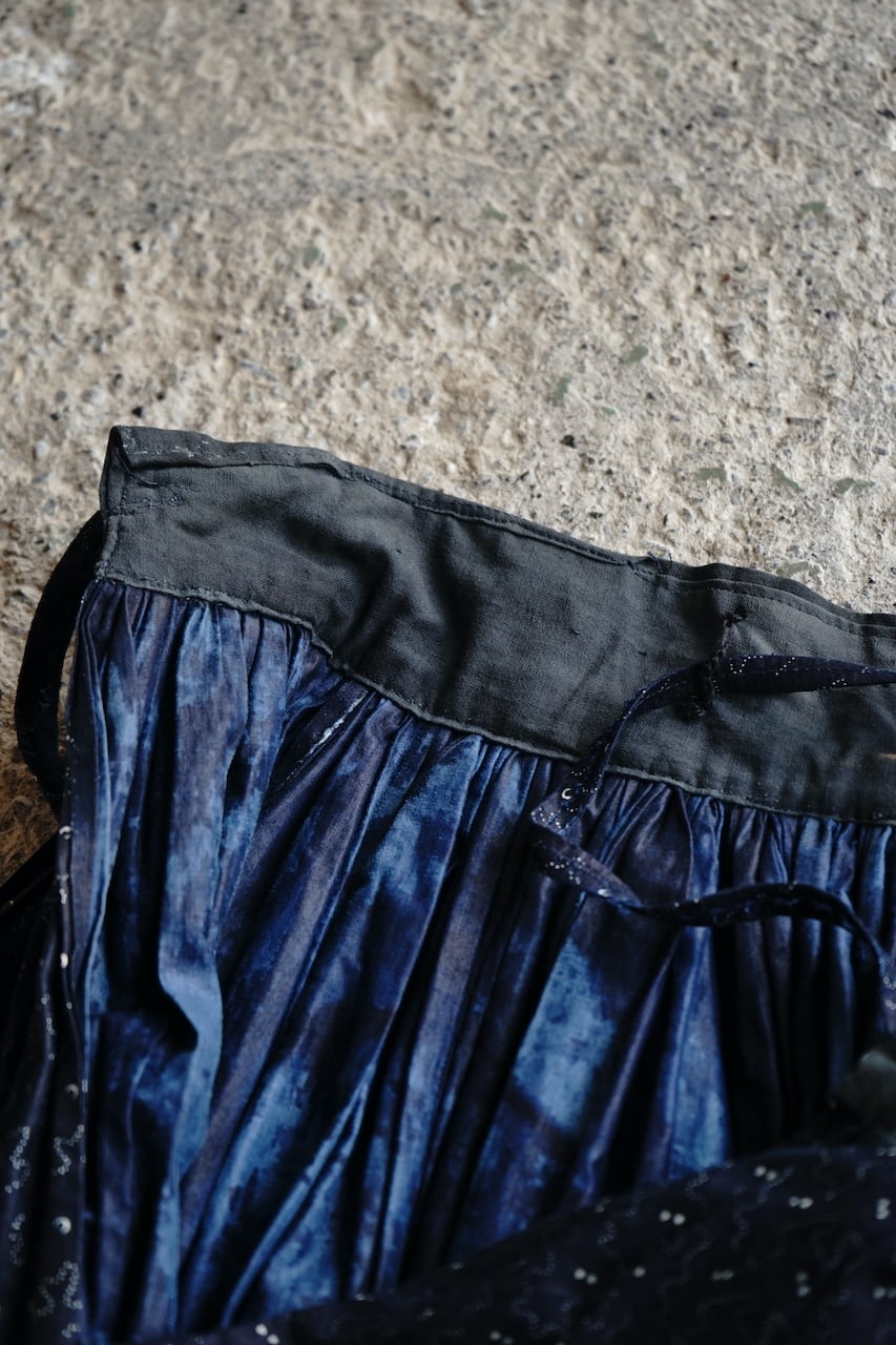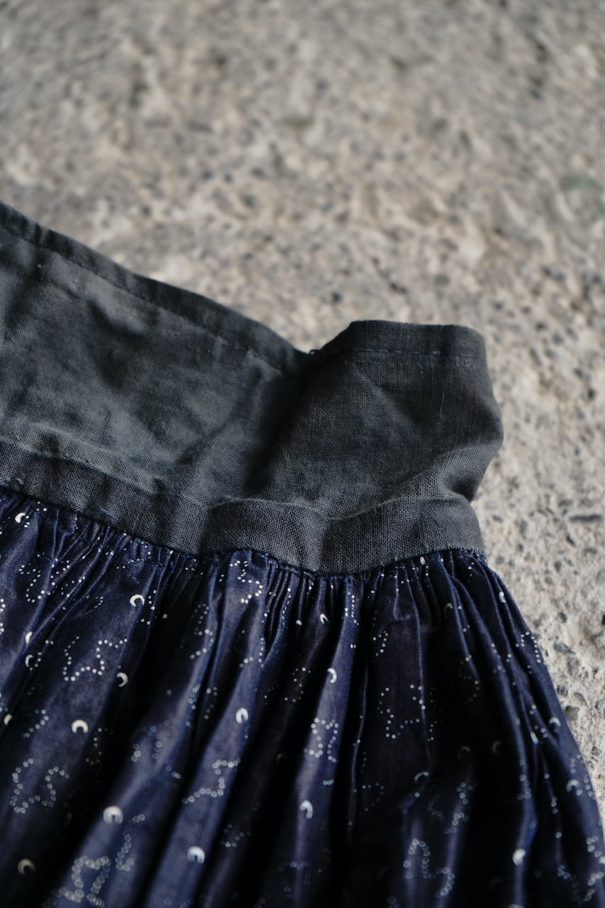 こちらはリネンの抜染プリントのタイプとは少し違い、よりシンプルで装いに馴染みやすいコットン地のスカートです。マキシ丈で裾の切り替えデザインも特徴的。細かなプリントもさりげなくとても素敵で深いインディゴの色味もとても美しいです。