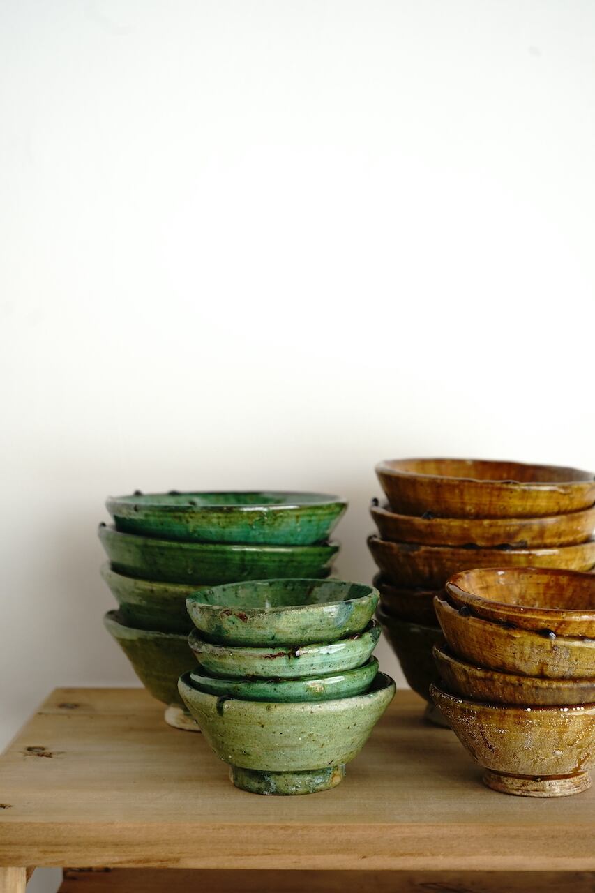 モロッコの南部・タムグルートというオアシスの村にて作陶されている陶器。椰子の木の根元にある土を原料としており、その土でしかこの風合いは出せないそうです。