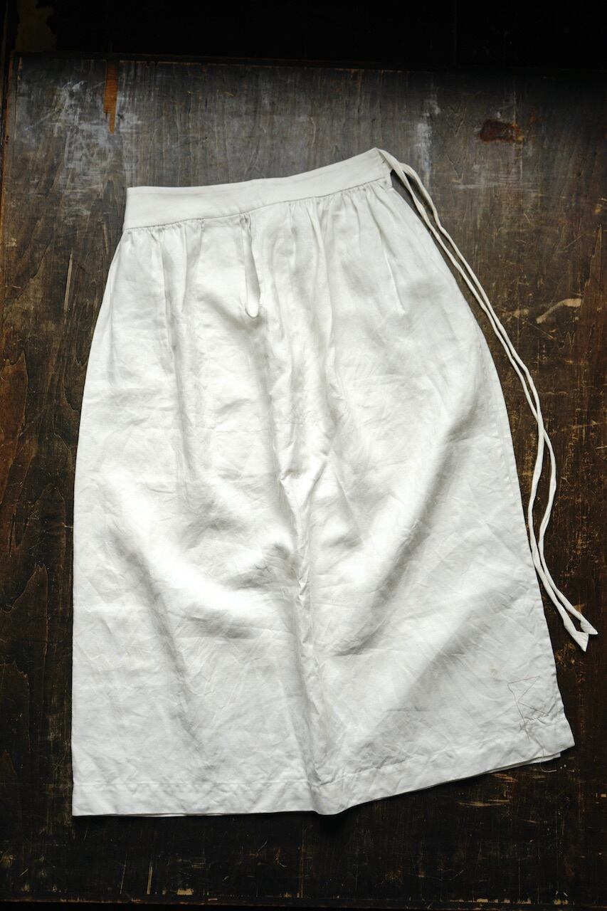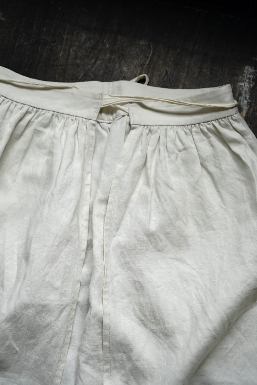 このファーマーエプロンは、元にしたvintageのように、職人の手仕事による細やかなギャザーやステッチがとても美しく、生地は1846年創業のイギリスの生地メーカーによるアイリッシュリネンを使用。使い込むほどに魅力を増す素晴らしいリネン生地が特徴です。