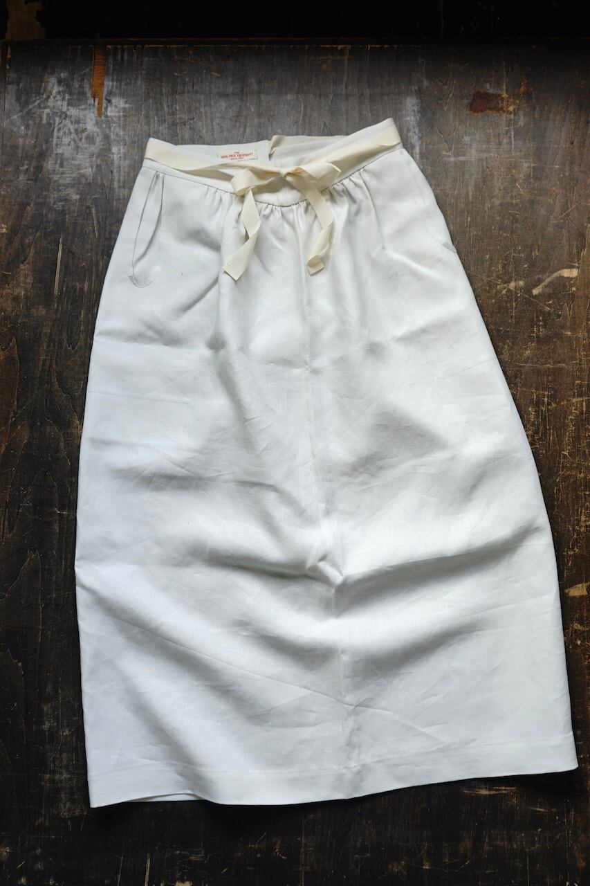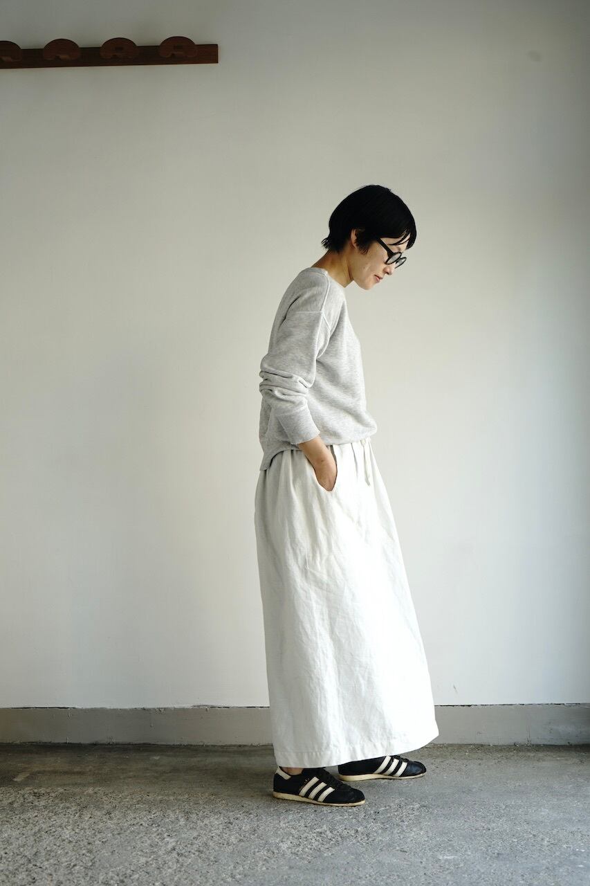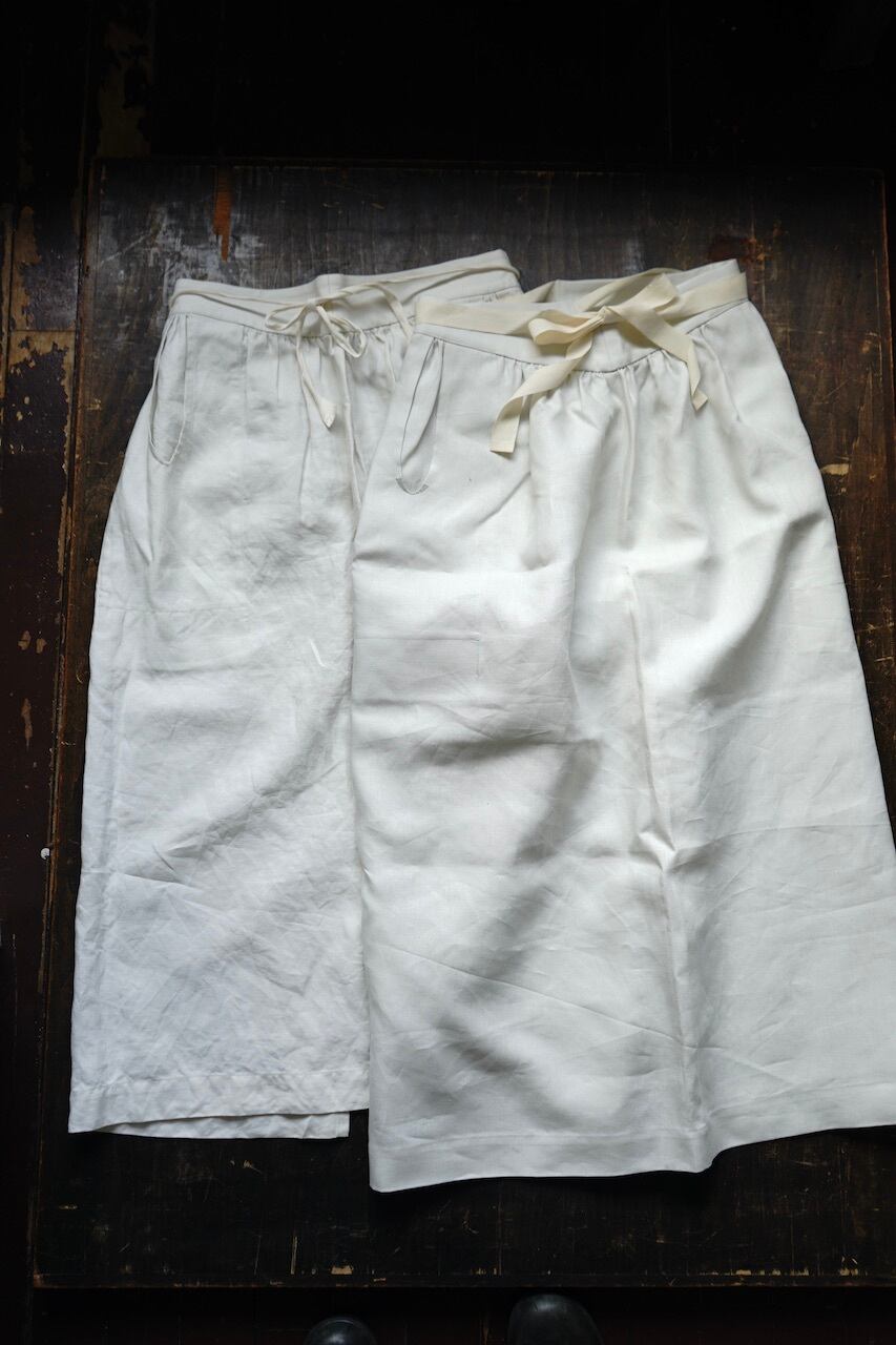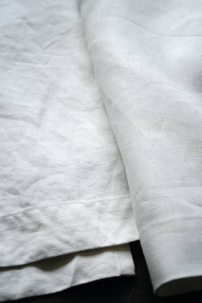 このしっかりと目が詰まったリネン生地は程よい重厚感と品のある光沢。元にしたヴィンテージの質感に極めて近く、未洗いだととても上品な風合いですが、ぜひ水を通してたくさん着て洗っていただきたいです。水を通し使い込むほどに生地に凹凸が出て素晴らしい風合いへと変化します。