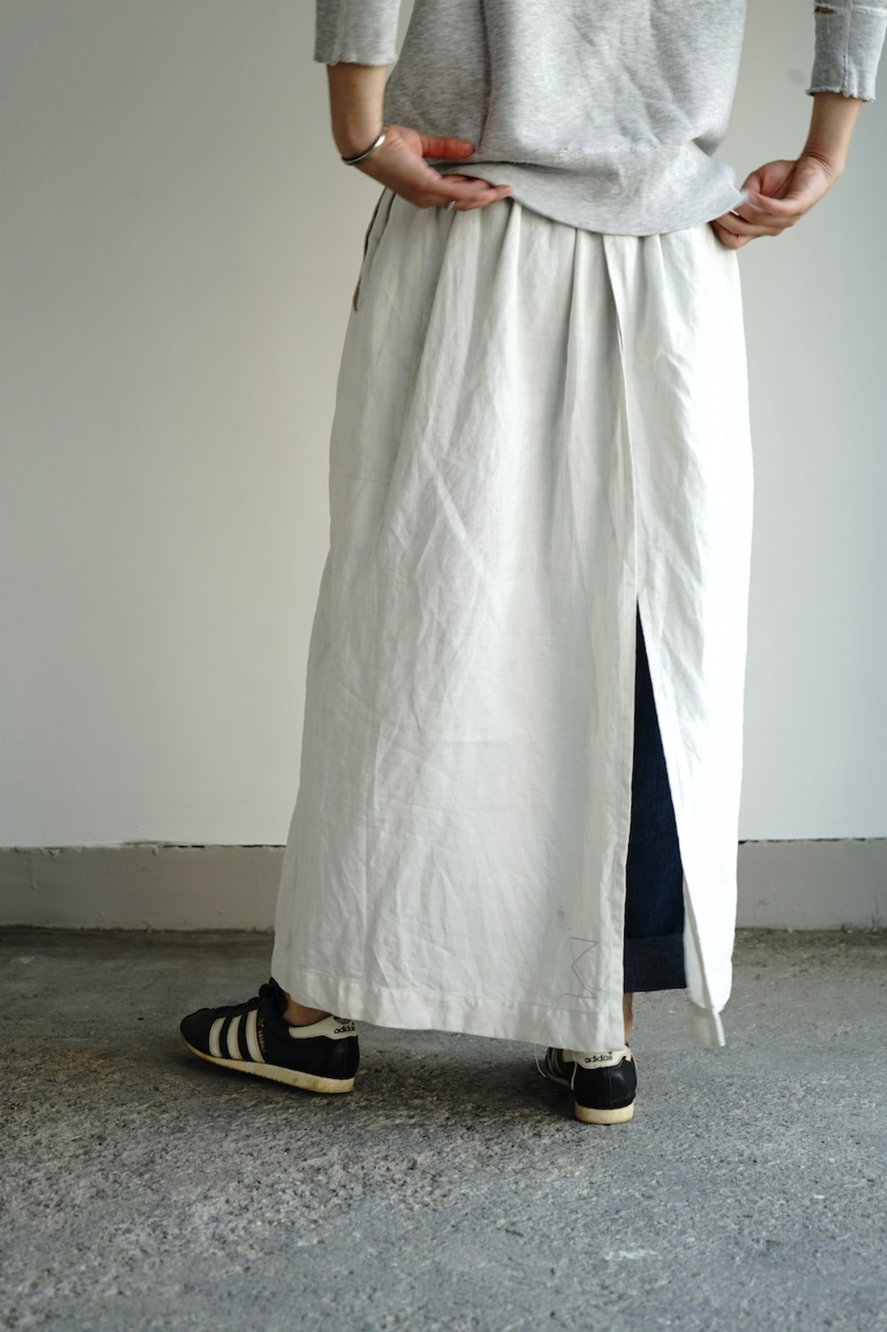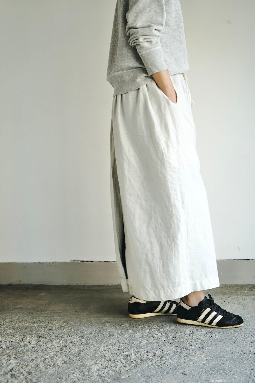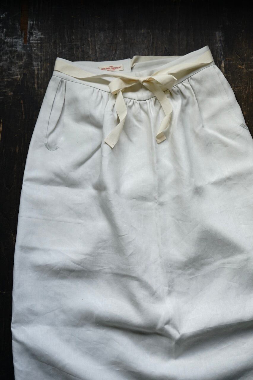 このしっかりと目が詰まったリネン生地は程よい重厚感と品のある光沢。元にしたヴィンテージの質感に極めて近く、未洗いだととても上品な風合いですが、ぜひ水を通してたくさん着て洗っていただきたいです。水を通し使い込むほどに生地に凹凸が出て素晴らしい風合いへと変化します。