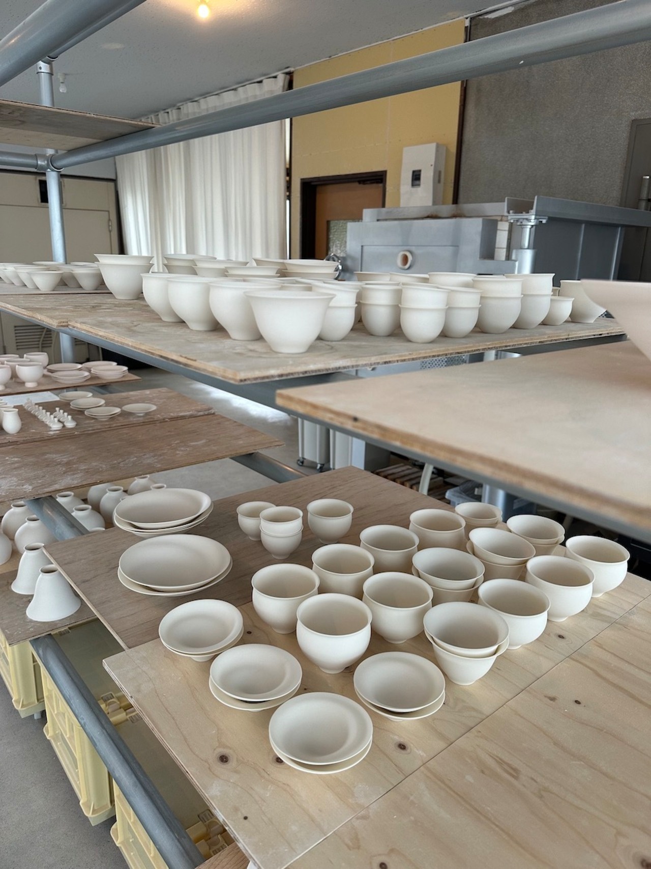 林沙也加さんの作る器は主に磁気をメインとしていて、ろくろで成形後に削り、素焼き、研磨、本焼き、仕上げの研磨。といったようにいくつもの工程を終え作られた器は、その作業量から成る美しさです。