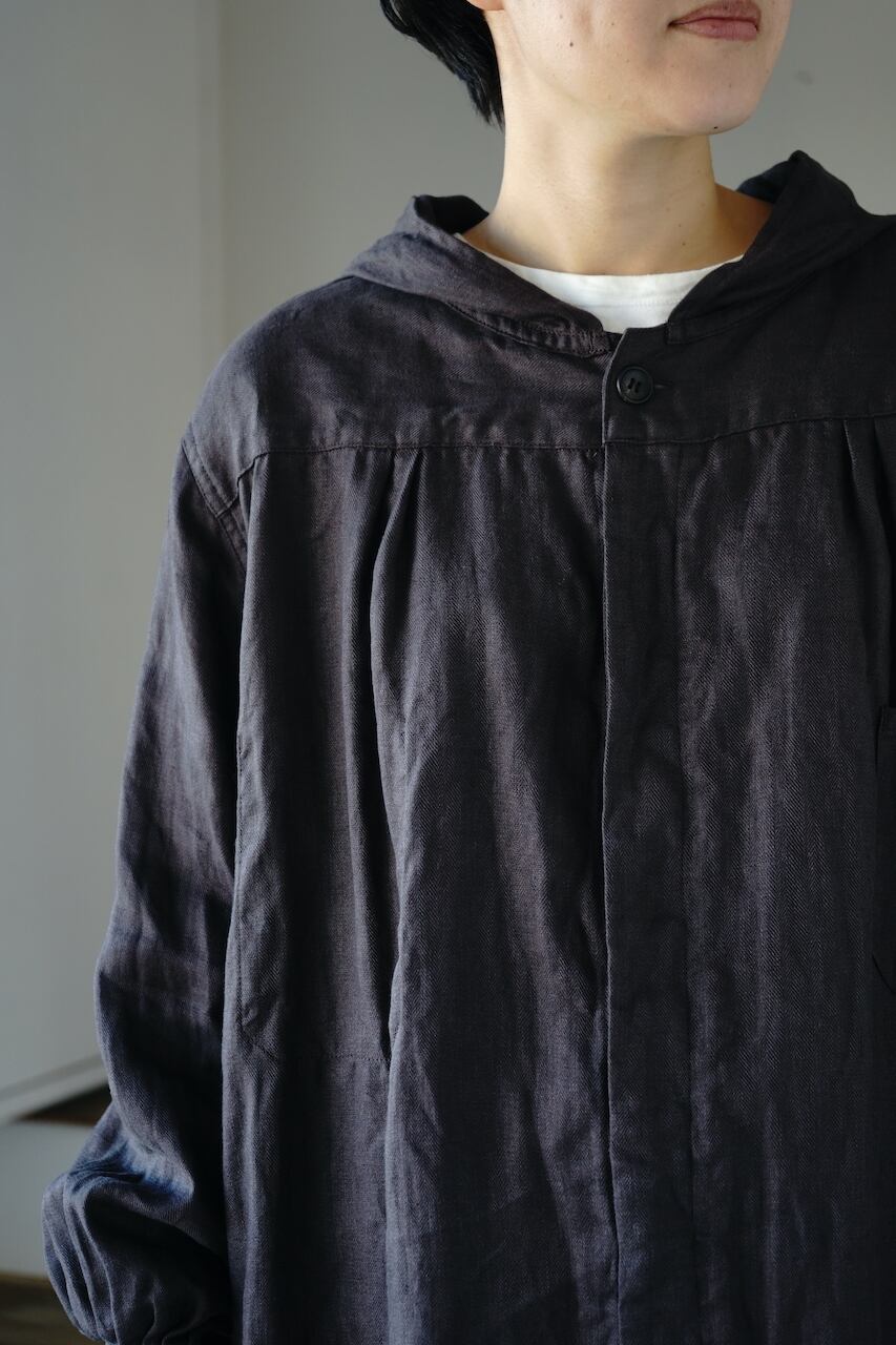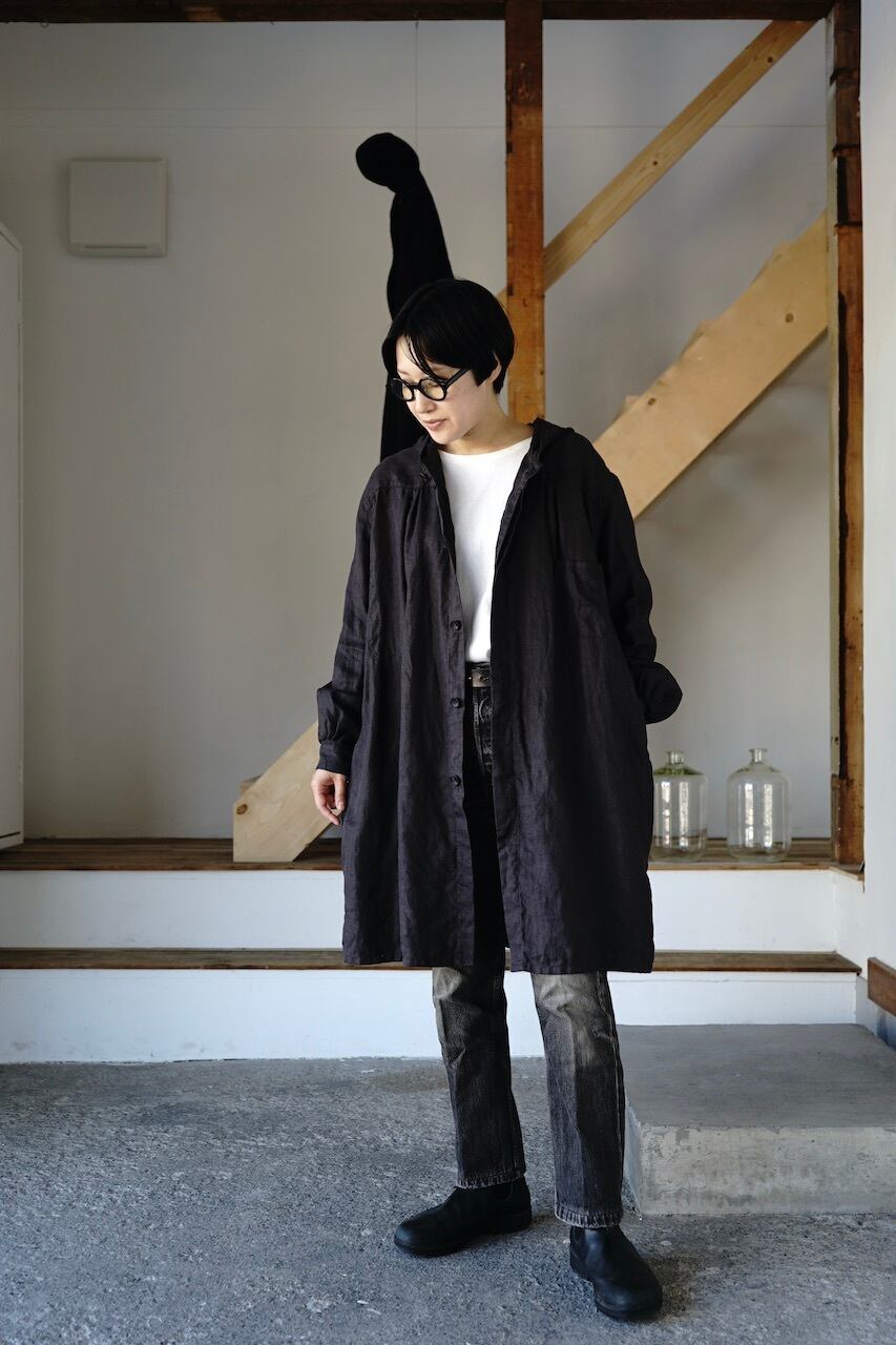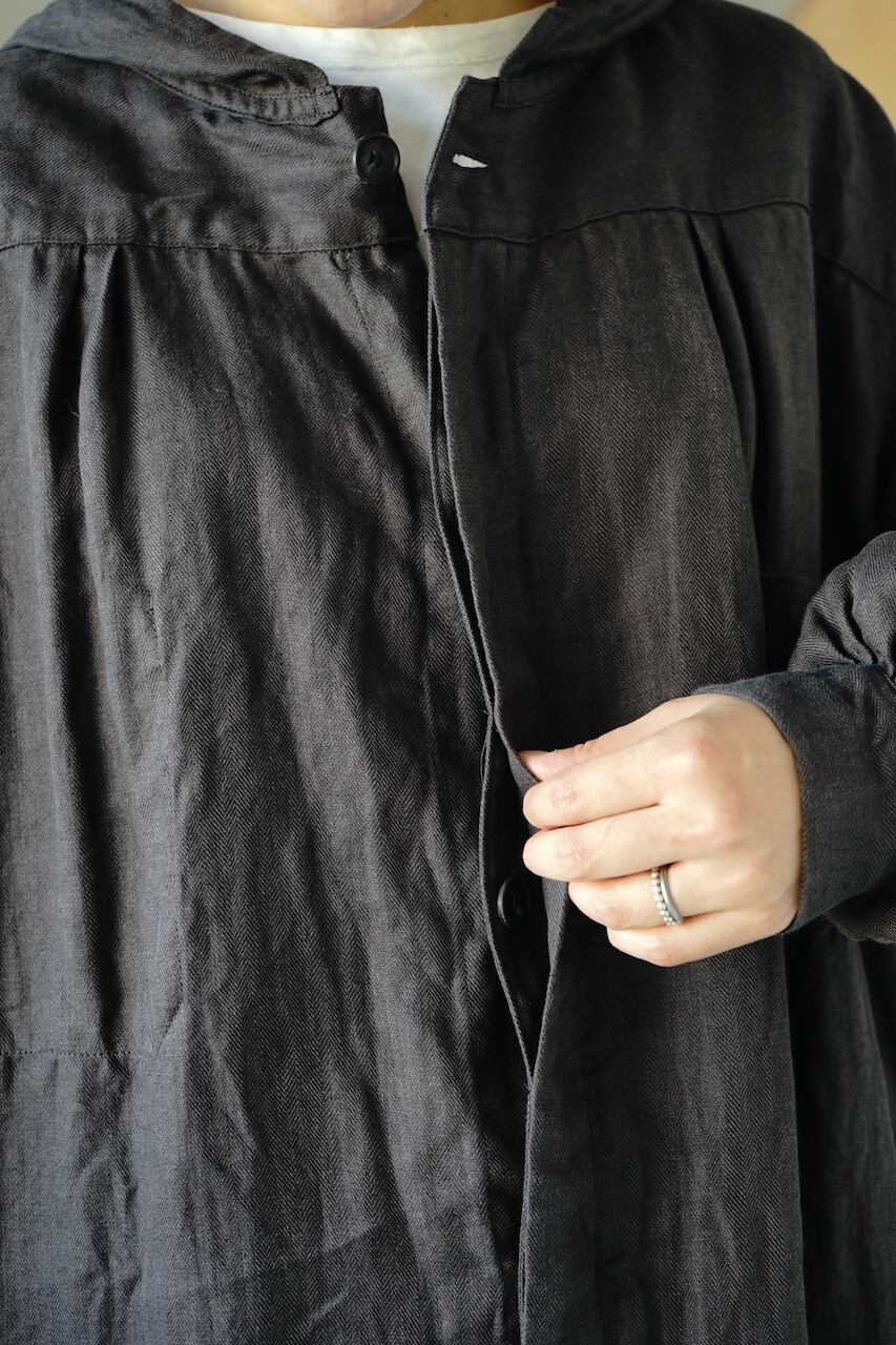 シャリ感と着込むにつれてどんどん滑らかにやわらかく風合いを増すヘリンボーンリネン。じゃぶじゃぶお洗濯をして、シワ感も楽しみながら取り入れていただきたいです。ボタンは水牛ボタンを使用しています。